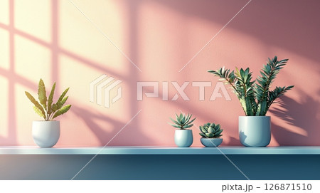 Soft Pastel Shelf Decor with Thriving Indoor Plants in Modern Minimalist Setting