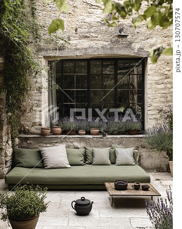 A cozy, sunlit outdoor courtyard with stone walls covered in ivy, furnished with comfortable seating, small tables, and a green velvet sofa, creating a tranquil retreat.
