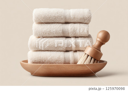 Experience pure relaxation with stacked white towels and wooden soap dish ideal for a serene spa vibe.