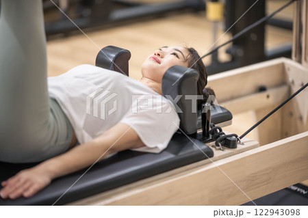 Woman doing Pilates exercise for core and back muscles on Reformer machine with determination and focus on strength body