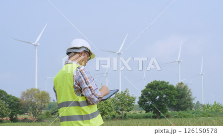 Engineer working with laptop at wind turbine field generating electricity for renewable clean energy