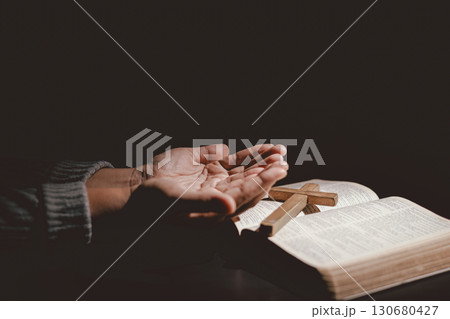 Hands folded in prayer on the Holy Bible, symbolizing faith, devotion, Christianity, hope, and spiritual strength. Concept of worship, meditation and trusting God Word.