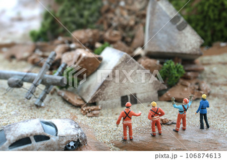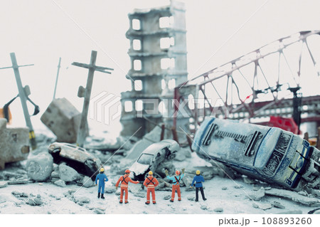 一座被災難或戰爭摧毀的城市和四處遊蕩的人們的立體模型。