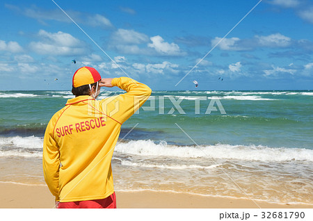 Professional beach lifeguards, set of characters. Rescue workers with lifebuoy and red medical first aid kit box. Rescuer patrols sea on jet ski. Security staff, safety on water worker. Vector.