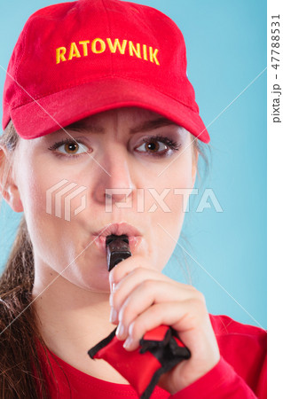 Hands, lifeguard and whistle by swimming pool for water safety, security or ready for rescue indoors. Hand of expert swimmer holding signal tool for warning, safe swim or responsibility for awareness