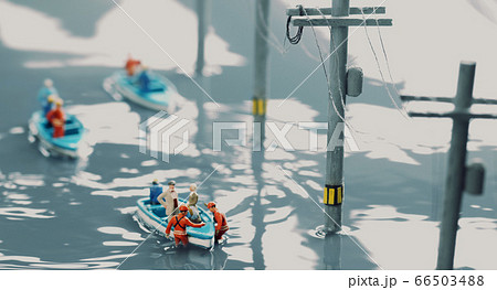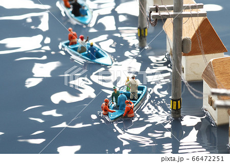 受洪水破壞的城市和救生艇救援隊的立體模型