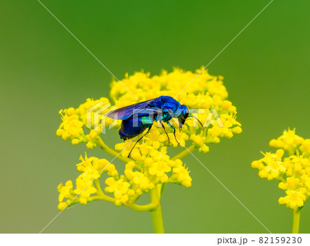 Ominaeshi,七種秋季草本植物之一,在傘房花序中綻放,開有許多黃色小花(自然光微距特寫)