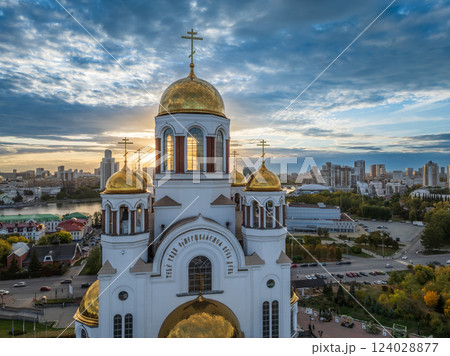 Autumn Yekaterinburg and Temple on Blood in beautiful clear sunset. Aerial view of Yekaterinburg, Russia. Translation of the text on the temple: Honest to the Lord is the death of His saints.