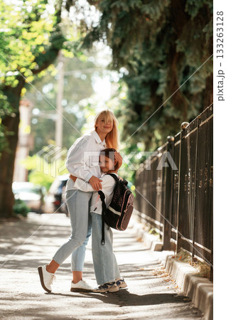 Embracing each other. Schoolgirl with her mother are outdoors together