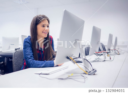 Female student smiling while using computer monitor and keyboard in computer lab, copy space