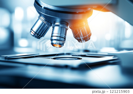 A close-up of a microscope in a laboratory setting with test tubes by Generative AI