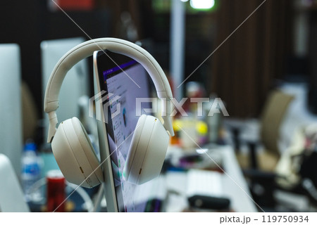 Young woman headphones sits listen to music use mobile cell phone. Concept for business, freelance.