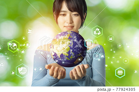女孩拿著上面長著植物的地球儀環境概念視覺