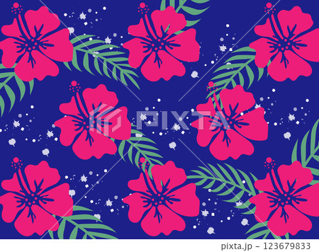 熱帶花卉木槿和龜背竹、檳榔棕櫚的無縫背景