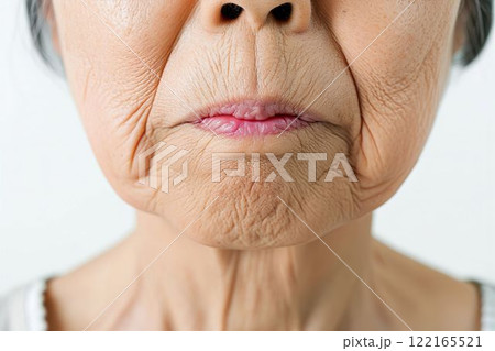 患有皺紋、下垂、老年斑(眼瞼下垂、眼袋、整形、嫩膚)的老婦人