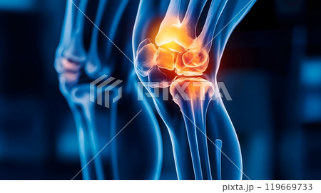 AI-generated content. Pain concept - athlete suffering from knee pain, pain is visualized with glowing bones