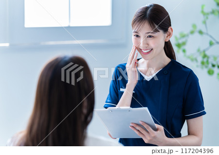 美學家或美容護士的接待或諮詢姿勢的前視圖,在淺藍色背景中看著相機