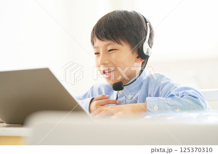 小學男孩一邊看著電腦螢幕一邊微笑著說話 |線上學習圖像