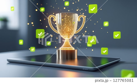 Digital tablet displaying a sparkling trophy with floating checkmarks and green blocks symbolizing achievement, success, and digital accomplishment in a modern workspace