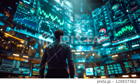 A businessman interacts with a financial graph screen display. The concept of investment, economic growth, and digital financial analysis. Generative AI.