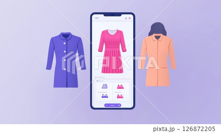 Illustration of Customer Journey Concept with Mobile Shopping App and Clothing Choices on Purple Background