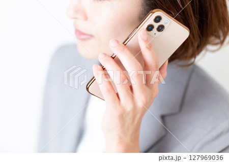 一位身穿灰色西裝的中年女子正在用智慧型手機聊天