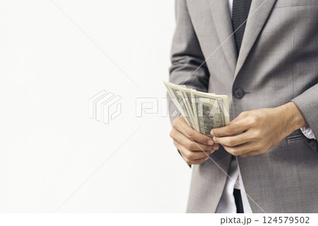 Hand holding loan money dollar bank note give financial payment. Man hands showing spread 100 dollar exchange cash payout. Saving Businessman counting money banknote bribe corruption concept.