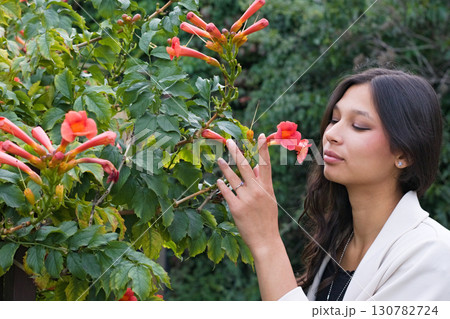 Young Indian woman with long dark hair standing near orange blossoms, gently raising her hand toward the flowers. A lifestyle and cultural beauty portrait