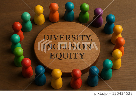A circular arrangement of multicolored wooden peg figurines around a blank wooden banner symbolizing diversity, inclusion, and equity