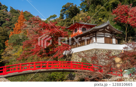 龍寺的鳳王閣和紅橋被秋葉環繞。大阪府箕面市