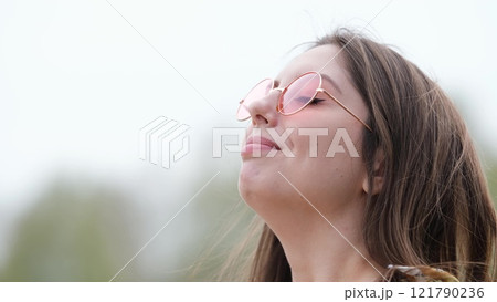Happy woman in pink sunglasses outdoors smiling