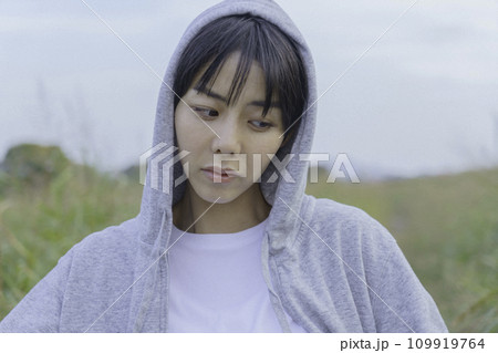 一位身穿連帽衫的年輕女子站在岸邊小路上的上半身肖像