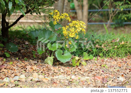 十二月,樹旁盛開著黃色的日本蜂斗菜花。