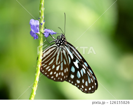 一隻淺藍色斑點的琉球鳳蝶停在一朵小小的馬纓丹花上吸食花蜜。