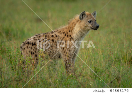 Spotted hyena cub stands in long grass