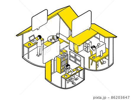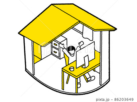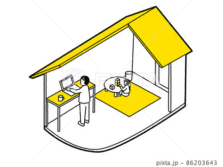一個在房子的站立式辦公桌上看筆記本電腦的人,旁邊是一個孩子,黃色版本