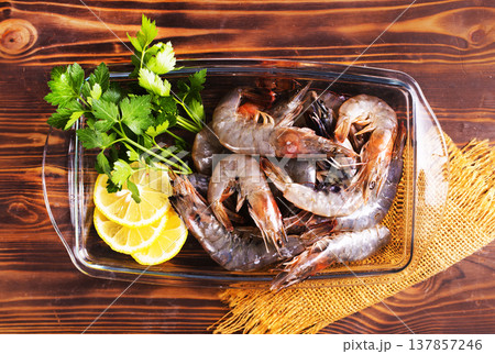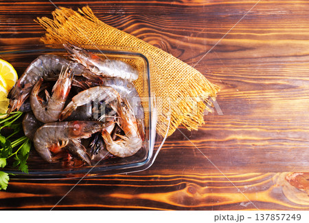 shrimps raw gambas seafood prawn healthy meal food snack on the table copy space food background rustic top view