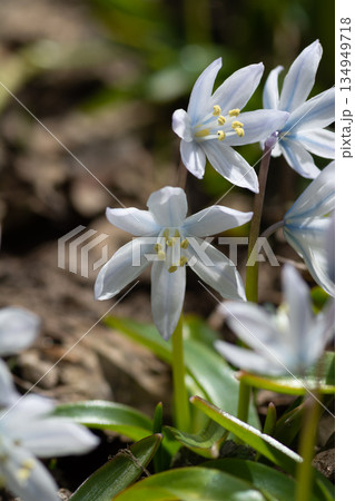 Blue flowers of Siberian squill or wood squill or Scilla siberica growing up on a sunny spring day