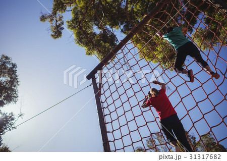 Boy climbing a net during obstacle course
