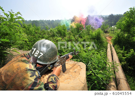 Mid section of military soldier holding a rifle