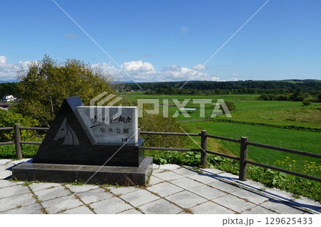 在北海道日高地區的純種生產牧場放牧的馬的父母子女