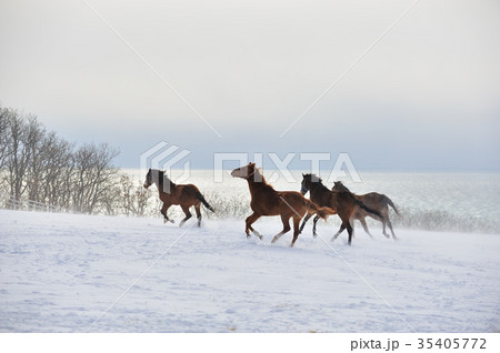 在北海道新加蓬放牧的一群馬