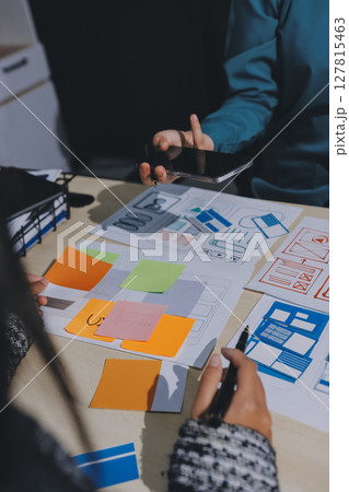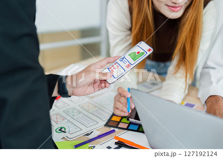UI designer and UX developer brainstorm idea to design the application interface. Creative digital development agency. UX UI concept