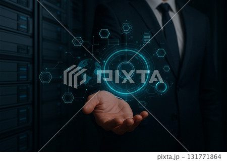 AI generated futuristic illustration of businessman holding holographic digital interface with glowing elements symbolizing technology innovation data and global network