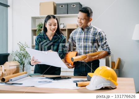 Engineer teams meeting working together wear worker helmets hardhat with on architectural project site and making model house. Asian industry professional team
