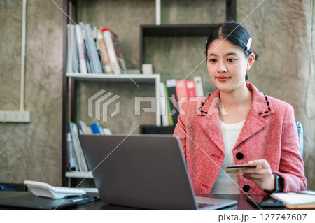Professional woman using a laptop and credit card for online shopping in a stylish office environment.