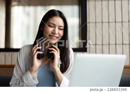 Cheerful businesswoman wearing headphones during a video call, expressing engagement in her financial work.