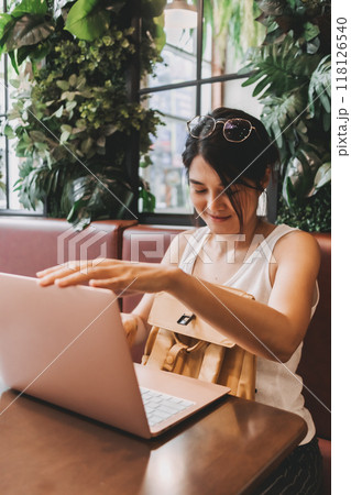 Woman finished her work and turning off the laptop computer.
