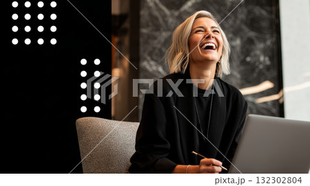 A woman is sitting at a desk with a laptop and tablet in front of her. She is smiling and she is enjoying her work