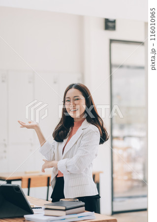 Happy young asian businesswoman sitting on her workplace in the office. Young woman working at laptop in the office.